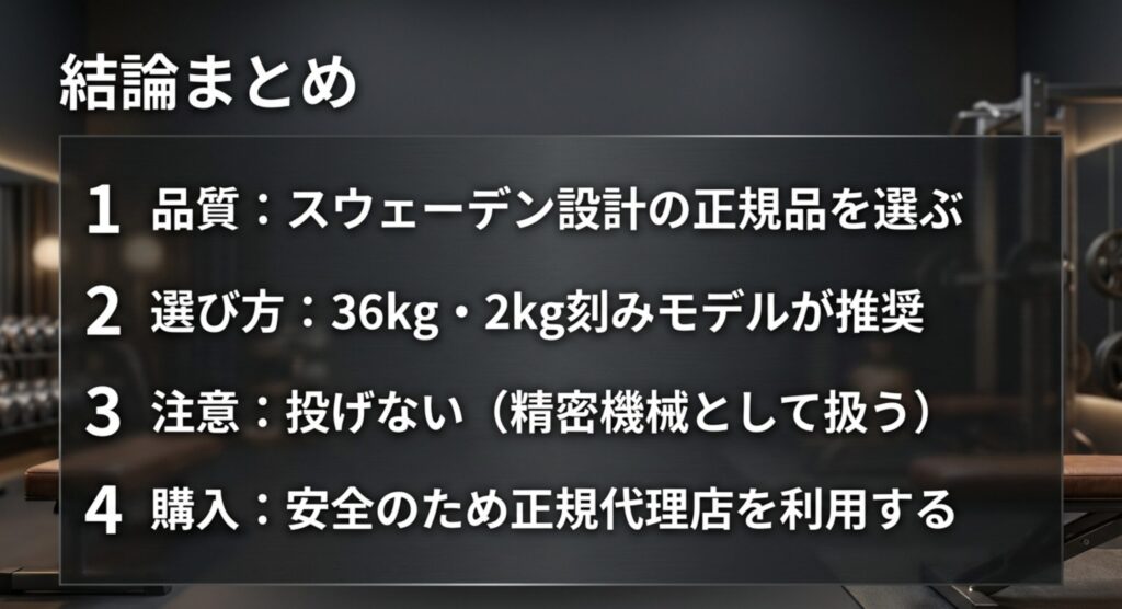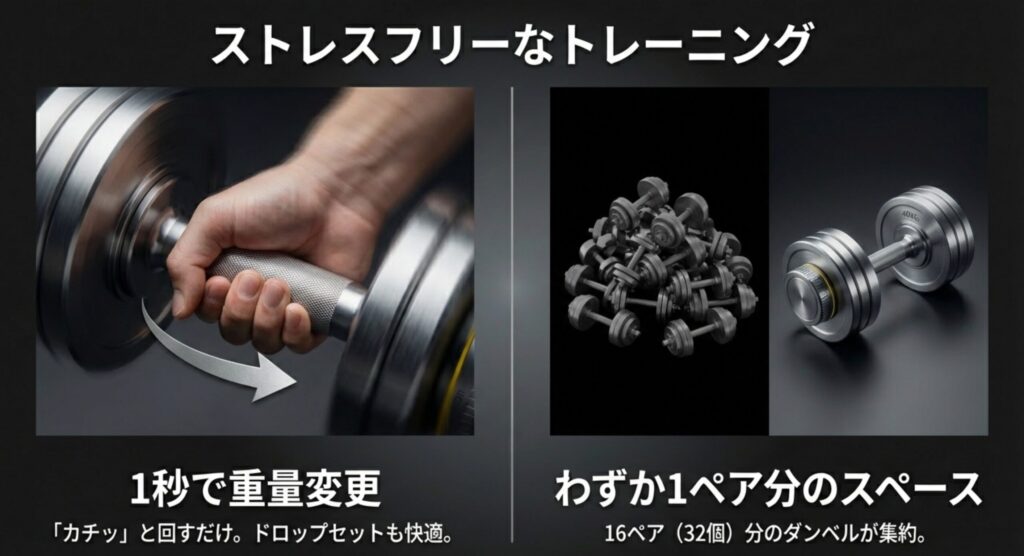 しかし、重さの違うダンベルを何ペアも買い足していく手間とお金、そして部屋のスペースが奪われることを考えれば、結果的に最もコストパフォーマンスに優れた「一生モノの自己投資」になるはずです。
