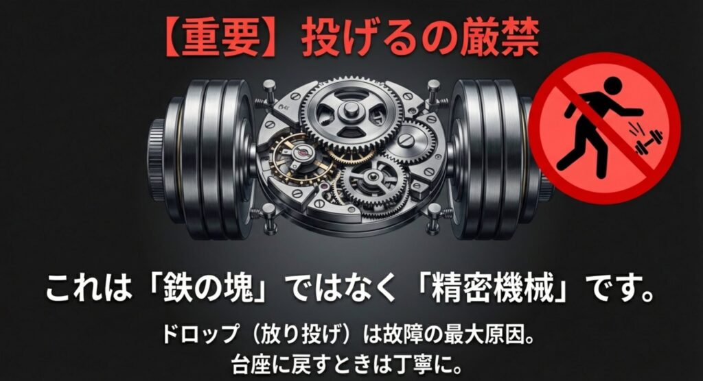 そのため、ジムに置いてあるような鉄の塊のダンベルのように、トレーニング終了時に床へ「ドスン」と乱暴に落とす(ドロップする)行為は絶対に厳禁です。