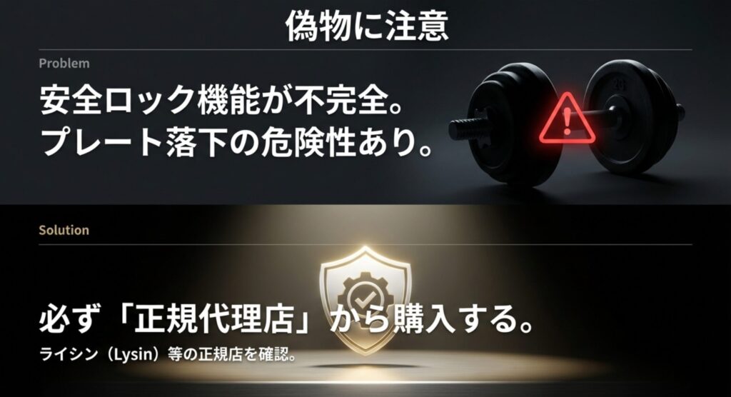 しかし、偽物はこの特許技術を模倣しきれておらず、トレーニング中に空中で突然ロックが外れ、重い鉄のプレートが足元や顔に落下してくるという大事故に繋がる危険性が報告されています。