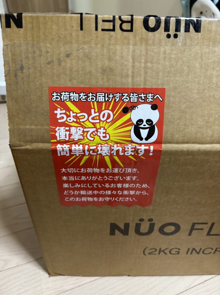 届いた箱には、配送業者さんへの丁寧な注意書きステッカー(可愛いパンダのイラスト!)が貼られていました。こうした細かな配慮は、やはり公式ライセンスを保持している正規代理店ならではの安心感ですね。
