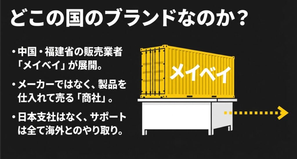 つまり、PanasonicやBridgestoneのように日本に支社があり、開発から販売、アフターサポートまでを一貫して行っているわけではなく、あくまで中国からの「直販・転売」に近い形態だということを理解しておく必要があります。