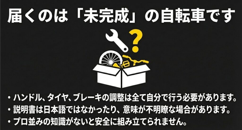 この手の海外製電動自転車は、輸送コスト(送料)を抑えるために、完成品ではなく「7割〜8割程度まで組み立てられた状態」で、巨大な段ボールに入って届くのが一般的です。