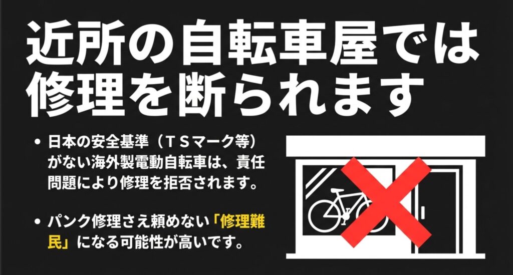 日本の一般的な自転車屋さん(チェーン店や個人店を含む)は、PL法(製造物責任法)やコンプライアンスの観点から、日本の型式認定(TSマーク)を取得していない海外製電動自転車や、違法改造の疑いがある車両の修理を断る傾向にあります。
