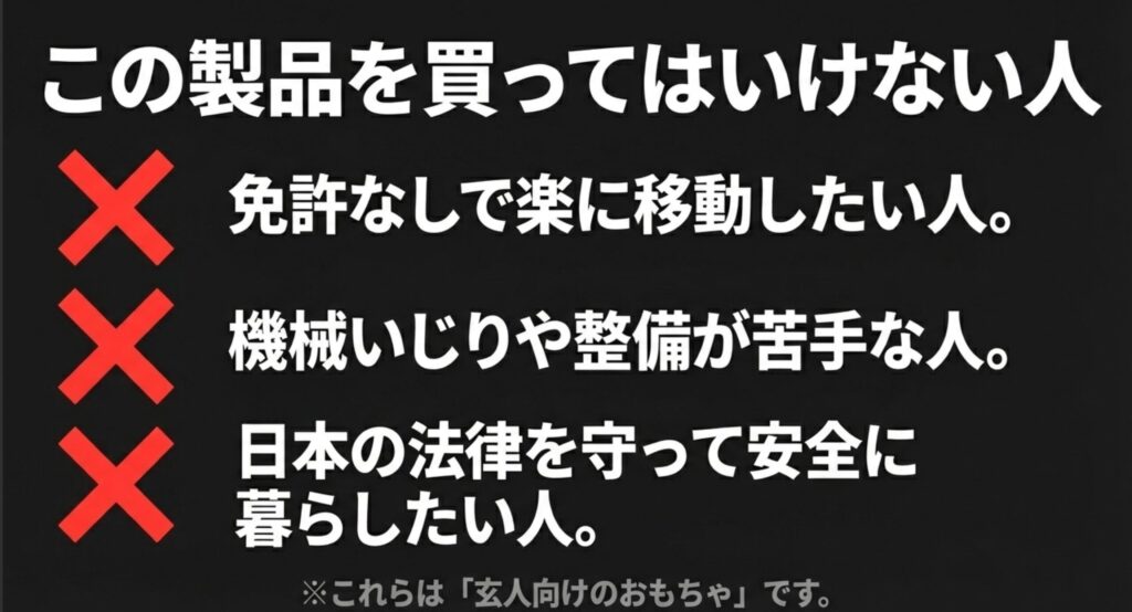 逆に言えば、広大な私有地を持っていてレジャーとして楽しむ場合や、自分で保安部品を完全に取り付けてナンバーを取得し、原付バイクとして楽しむ覚悟がある上級者にとっては、コスパの良い「おもちゃ」になるかもしれません。