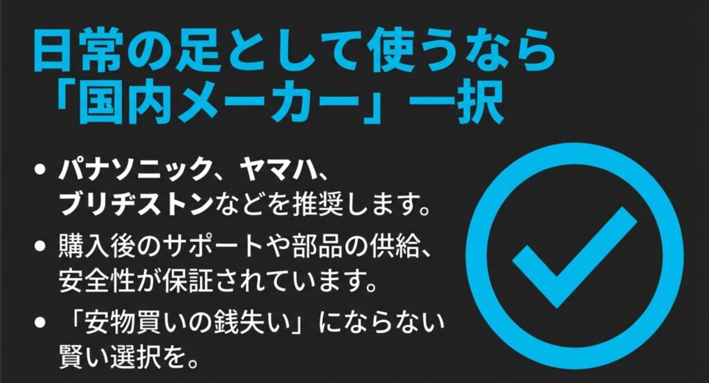 もし、日常の足として安全・安心に使いたいのであれば、やはりPanasonicやYamaha、Bridgestoneといった、国家公安委員会の型式認定を取得している国内メーカーの電動アシスト自転車を選ぶのが、結果的には一番安上がりで賢い選択かなと私は思います。