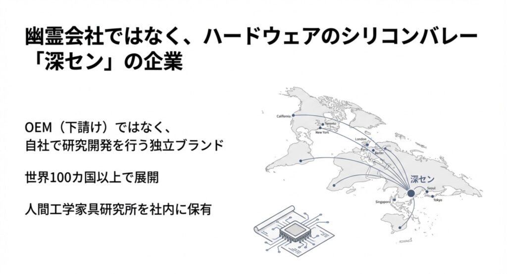 Sihoo(西昊)は、中国の広東省深圳市に本社を置くオフィス家具メーカーです。2011年に設立され、単なる他社ブランドの下請け工場(OEM)ではなく、自社で研究開発(R&D)から製造、販売までを一貫して行う独立したブランドとして急成長してきました。