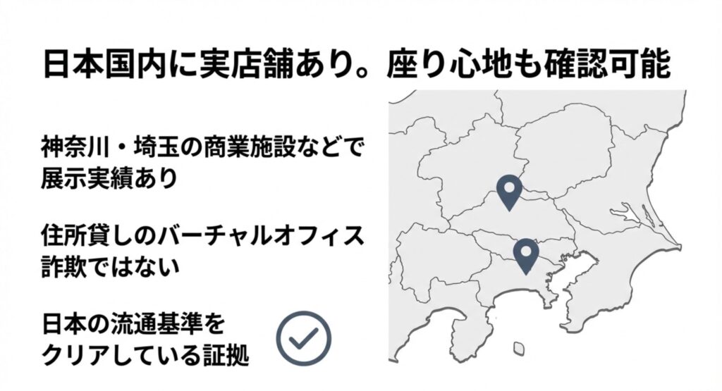 ショッピングモール内に実体のある店舗を構えているということは、それだけ品質や供給体制が日本の流通基準を満たしている証拠とも言えます。また、後述する日本のオフィス家具代理店「オフィスコム」のショールーム(東京・大阪など)でも、一部のコラボモデル(S300-OCなど)を試座できる場合があります。「幽霊会社だったらどうしよう」という心配は無用ですね。