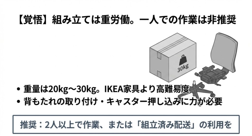 高機能なオフィスチェアは、頑丈な金属製ベースや複雑なリクライニング機構を搭載しているため、総重量が20kg〜30kgにもなります。これを巨大なダンボールから取り出し、各パーツをボルトで固定していく作業は、IKEAの家具組み立てよりも数段ハードルが高いと考えてください。