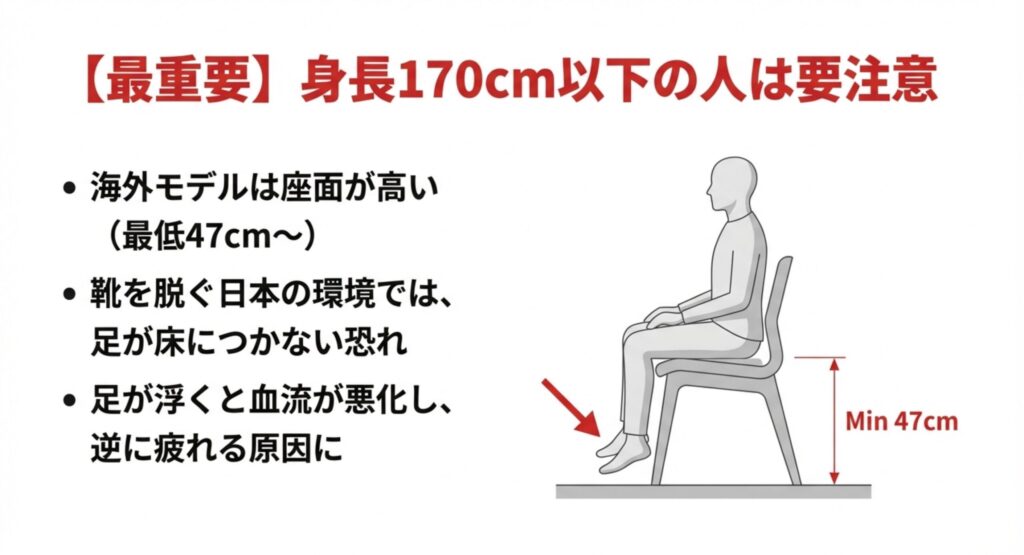 Amazonなどで販売されているグローバルモデル(並行輸入品など)の場合、座面を一番下まで下げても47cm〜48cm程度あることがあります。これは、身長175cm以上の人が靴を履いて座るのに適した高さです。身長170cm以下の人が靴を脱いで使う日本の住環境では、「かかとが完全に床につかない」という事態になりかねません。