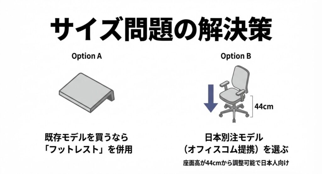 もし既に購入してしまった場合や、どうしてもデザインが気に入ってグローバルモデルを買う場合は、足元に「フットレスト(足置き台)」を置くことで解決できます。足の置き場を高くしてあげれば、座面が高くても太ももの圧迫を防ぐことができます。