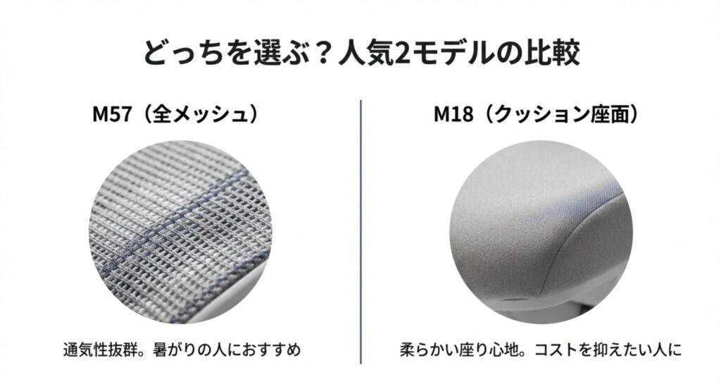 個人的には、日本の蒸し暑い夏を考えると通気性抜群の「M57」がおすすめです。座面に熱がこもらないので、長時間座っていても不快感がありません。一方、体重が重めの方や、メッシュの「張り」による圧迫感が苦手な方は、厚手のクッションを採用している「M18」の方がお尻に優しいと感じるかもしれません。