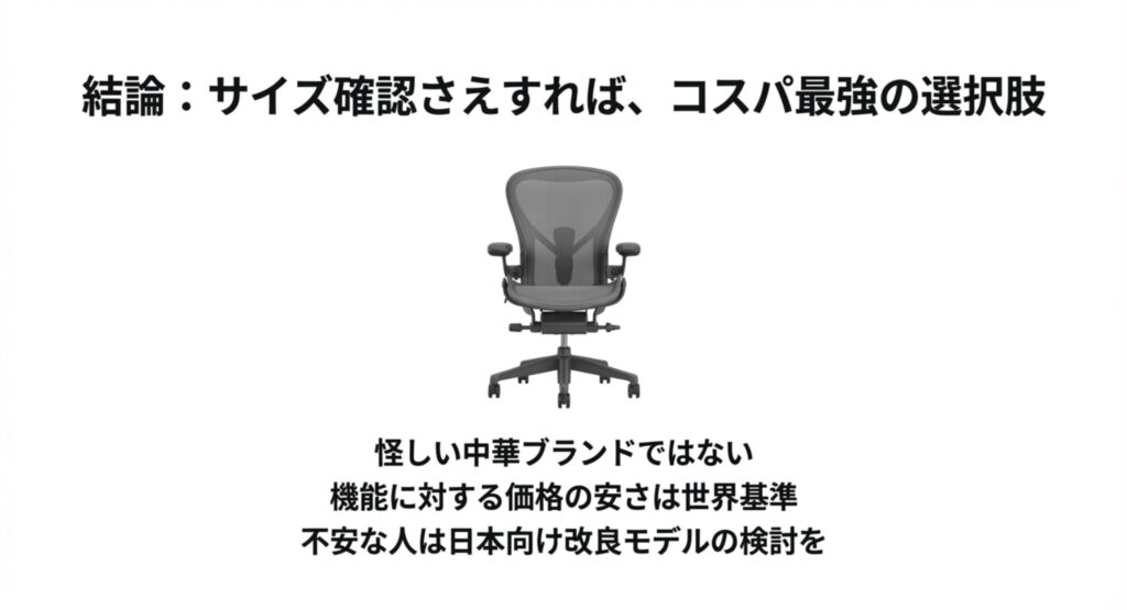 私がリサーチした限りでは、予算が許すなら、並行輸入品を安く買うよりも、日本人の体格に合わせてローカライズされたオフィスコム取り扱いモデルを選ぶ方が、長期的な満足度は圧倒的に高いはずです。オフィスコム経由であれば、独自の保証延長や手厚い日本語サポートも受けられるため、「安心を買う」という意味でも賢い選択肢と言えるでしょう。